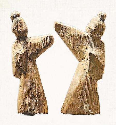 舞俑有獨(dú)舞俑和對舞俑兩種組合,舞者主要通過手臂的屈伸表現(xiàn)出舞蹈姿勢。通常先雕出舞俑姿態(tài),然后以白色為底色,用墨線和紅線繪頭發(fā)、衣袖,下垂處呈圓角方形。面部五官基本被省略,主要突出的是動態(tài)的翩翩舞姿。高度通常在20厘米左右。