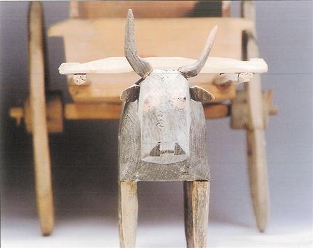 木牛俑高度約20厘米左右,通常先雕出輪廓,然后通體飾黑彩,白彩勾眼和絡(luò)頭等。從造型來看,木牛目視前方,屈背,四足蹬地,身軀健壯有力。拉著牛車或拉木犁的牛俑一般繪有絡(luò)頭,表現(xiàn)了田間勞作的情景。到西漢時(shí)期,隨著“軍事屯田”與“徙民實(shí)邊”政策的推行,牛耕技術(shù)在甘肅河西地區(qū)逐漸普及開來。