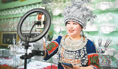 在古州鎮(zhèn)老街,銀飾店店主在進行網(wǎng)絡直播銷售銀飾。