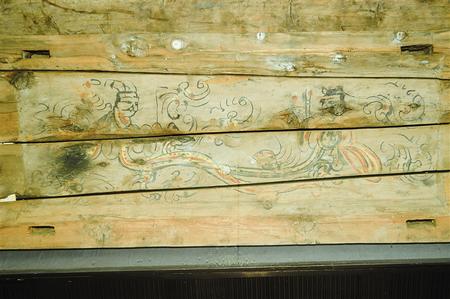 1998年新城魏晉南墓出土。這副完整的木棺由棺身和棺蓋組成,棺蓋內(nèi)側(cè)有一長(zhǎng)方形凹面,內(nèi)彩繪伏羲女?huà)z圖。伏羲女?huà)z人首蛇身,兩尾相交,伏羲在右,左手執(zhí)矩,女?huà)z在左,右手執(zhí)規(guī)。伏羲女?huà)z周?chē)椩茪饧y。棺身呈長(zhǎng)方體,兩檔頭用墨線勾畫(huà)星象圖,棺內(nèi)側(cè)四壁彩繪幃帳、絹帛、蠶繭等圖形。