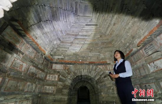 位于甘肅嘉峪關(guān)市的嘉峪關(guān)新城魏晉墓群,內(nèi)有千余座魏晉古墓,從1972年起,先后發(fā)掘18座,其中9座為畫像磚墓。磚壁畫取材于現(xiàn)實生活,用連環(huán)畫的方式反映出了當時河西地區(qū)生活、生產(chǎn)、軍事、文化的真實情景,具有濃厚的生活氣息。目前只開放的六號墓,其壁畫內(nèi)容豐富,具有很強的代表性。高展 攝