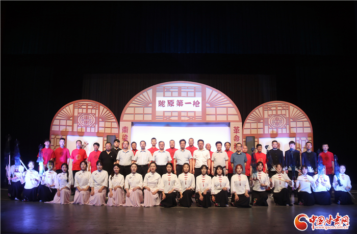 《隴原第一槍》全劇分希望、播火、誆宴、奪槍、功捷5場,演出團隊分為前臺演唱組、樂隊伴奏組、影人挑纖組、嘛簧幫唱組,演職人員中有國家級非遺代表性傳承人2人,省級非遺代表性傳承人2人,市級、縣級代表性傳承人近10人,加上隴東音樂學(xué)院學(xué)生共50人參與了演出。