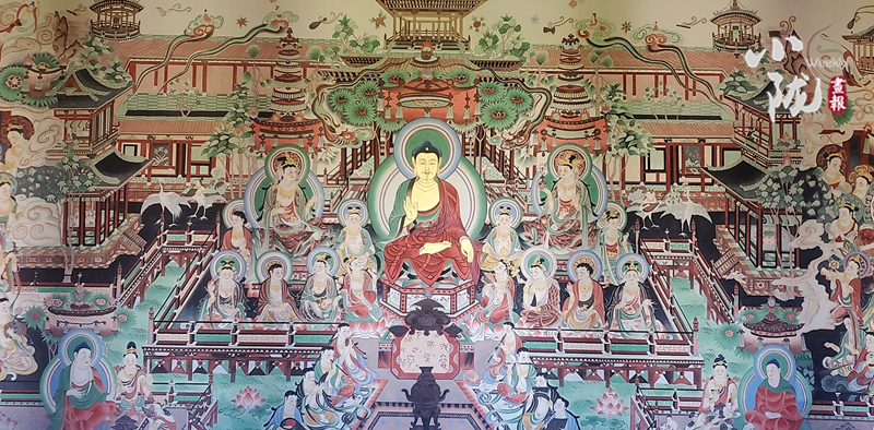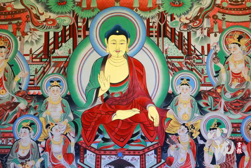 近日,一副長(zhǎng)15米、高6米的大型臨摹復(fù)制敦煌壁畫《無(wú)量壽經(jīng)變》在武威鳩摩羅什寺完美竣工,將于近期對(duì)外開放。