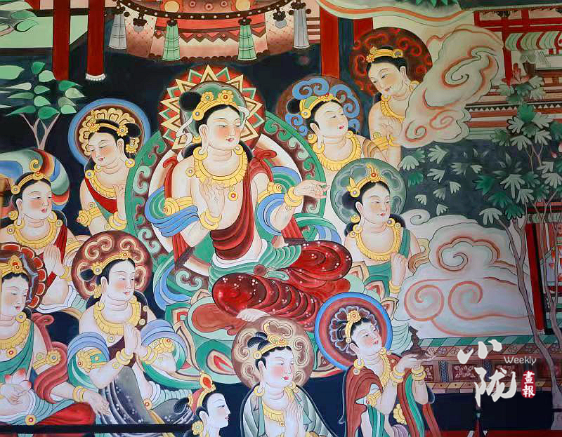該壁畫是按照敦煌莫高窟第220窟唐代《無(wú)量壽經(jīng)變》壁畫為原型,選址鳩摩羅什寺旃檀佛殿正面墻體,由敦煌畫院畫師張杰龍臨摹再創(chuàng)作,融入了敦煌莫高窟唐代112窟壁畫局部經(jīng)變內(nèi)容,與原作既有相似,但又不完全是原作。