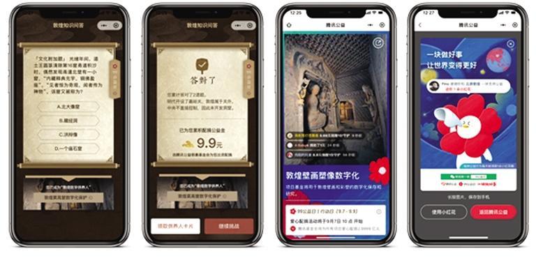 “云游敦煌”的“聲動畫語”讓壁畫“活”了起來,用戶可以通過觸點的方式進入到不同的篇章中,通過動畫欣賞敦煌壁畫中晚唐時期的生活場景,并獲得與當時社會民俗、服飾等相關的文化知識。觀看完動畫后,用戶還可以通過參與文化問答挑戰(zhàn),為中國敦煌石窟保護基金會募集善款。答對題目越多,募集到的善款也將隨之增多。款項將由騰訊公益慈善基金會直接出資,并全部用于敦煌莫高窟第427窟、145窟、138窟的數字化保護工程。通過這種方式讓每一位參與的用戶,都能夠用自己的知識為石窟數字化保護助力,成為新時代的敦煌“數字供養(yǎng)人”。