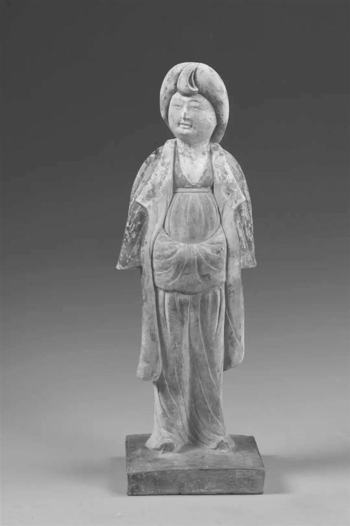 正大氣象,不僅在書法,也滲透到了民眾日常生活中。甘肅慶城博物館收藏有一件彩繪貴婦俑。這是唐開元十八年(730 年)的作品,雙手籠于胸前,站在方形臺座之上,一副唐代貴婦的裝扮。