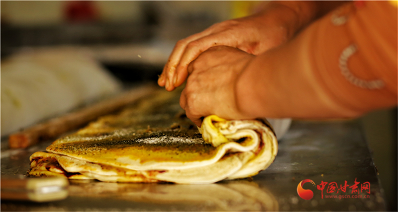將放好佐料的層層面餅拉扯,卷成筒狀。