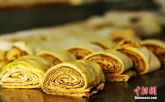 圖為將放好層層佐料的面餅拉扯,卷成筒狀。張文 攝