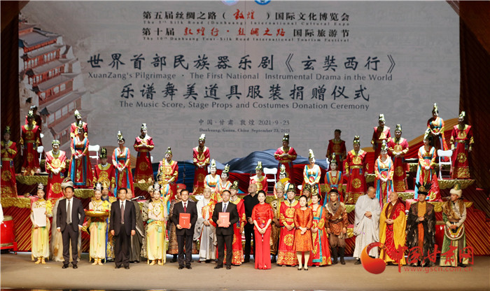 演出結束后,現(xiàn)場舉行了簡潔而隆重的“大型民族器樂劇《玄奘西行》樂譜舞美道具服裝捐贈儀式”,中央民族樂團將價值360萬元的樂譜、舞美、道具和服裝捐贈給甘肅演藝集團歌舞劇院,并指導甘肅省文藝院團將民族器樂劇《玄奘西行》打造成為弘揚絲路精神、推動絲路文化交流融合的經典劇目。中央民族樂團作為海內外規(guī)模最大、藝術最完備的綜合性國家級民族音樂表演團體,對甘肅文藝事業(yè)和地方樂團創(chuàng)作發(fā)展和人才培養(yǎng)給予大力支持,為甘肅文藝事業(yè)發(fā)展做出了重大貢獻。