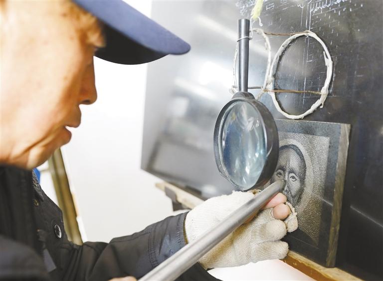 在大理石板上雕刻,是傳統(tǒng)手工技藝影雕的一種。這種雕刻方式采用墨玉、山西黑等純色石材,經(jīng)過(guò)水磨拋光后,在磨光面上要把雕琢的圖像輪廓描繪出來(lái),根據(jù)黑白明暗成像原理,用特制的像針一樣細(xì)小的合金鋼頭工具,通過(guò)運(yùn)用腕力調(diào)節(jié)針點(diǎn)疏密粗細(xì)、深淺和虛實(shí)線變化而表現(xiàn)圖像。