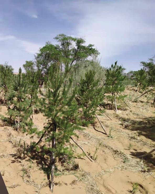 我和同伴撲進沙海柔軟的懷抱。認識到,再小的沙粒,也不能與塵世隔絕,我與沙,結(jié)緣于此。沙海里,一沙一世界。黃沙大膽赤裸地暴露在天幕蒼芎下,以大,以小,涵納無窮。“沙沙”的足音里,印下我深深淺淺兩行腳印,宣告著浪漫與踏實的存在。我來到習近平總書記親手栽植的“五棵松”下,仰視青松,綠云葳蕤,生機勃勃??倳浀年P(guān)懷和鼓勵,黃沙熱熱地、輕輕地長出了更多綠色羽翼,這羽翼在不斷地生長壯大,有“代代相傳”的精神,綠色終究會覆蓋全部騰格里。捧起一捧黃沙,細沙像嬰兒肌膚般的柔滑,我試圖用臉貼近它,這些黃色的小精靈,從我指縫間輕盈地流淌到松下,似乎在暗示我,要把自己的夢筑進治沙精神的瀚海里。科學家們已作出結(jié)論:沙漠是人類最后的寶地,別看它現(xiàn)在荒蕪,它里面蘊藏著無盡的寶藏和財富。