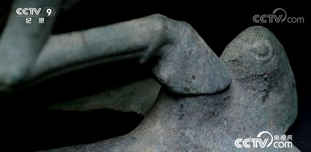 馬騰空的三條腿,同側的兩個同時向一個方向騰起,俗話說“順拐”,在馬的奔跑中通常是看不到這種姿態(tài)的。有一個專門的術語,把這叫“對側步”,據(jù)說古代的大宛馬是走對側步的高手,它因擁有與野生動物相媲美的奔跑能力而備受人們贊賞。所以有人認定我這馬的原型,就是西來的大宛馬,也是人們口口相傳的“天馬”。