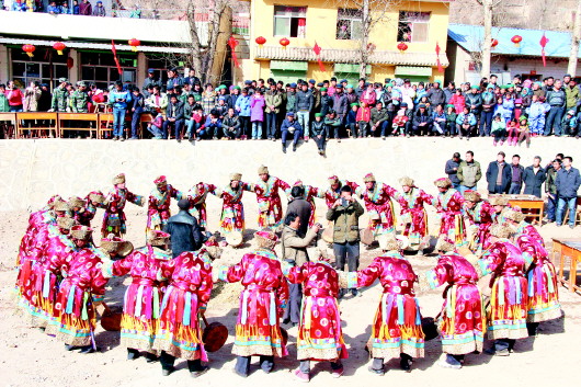 在岷縣,巴當(dāng)舞只在中寨鎮(zhèn)的古莊村、扎那村牙地社和一路村流傳,尤其古莊村最為鼎盛且具規(guī)模。這里毗鄰卓尼縣藏巴哇鎮(zhèn),藏漢兩地僅一公里之遙,情感相連,民心相通。長期以來,群眾在經(jīng)濟、文化、婚姻等方面交流密切。時至今日,扎那、古莊等村群眾春節(jié)吃肉仍遺留著藏民族彪悍豪爽的風(fēng)格:一大盤“手把肉”端上來,上面插一把小刀,客人可以自削自啖,這種神秘的文化符號似乎無聲訴說著藏漢兩地的過往、發(fā)展和變遷……