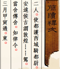 木簡1枚(出土編號(hào):Ⅱ90DXT0213③:135),1990年出土于敦煌懸泉置遺址。長7.2、寬1.3、厚0.25厘米。木簡上殘,兩行書寫,字跡模糊,難以辨識(shí)。簡文作“二人。使都護(hù)西域騎都尉、安遠(yuǎn)侯吉謂敦煌……駕,當(dāng)舍傳舍,如律令。三月甲寅過,東。”。簡中“使都護(hù)西域騎都尉”是西域都護(hù)的正式官名,“騎都尉”當(dāng)指以本官都護(hù)西域,是其本職,而“使”則突出了使職性質(zhì)。這是懸泉置記錄的一份傳文書,簡文不完整,大意是說某年三月甲寅日,西域都護(hù)鄭吉派遣的使者自西向東行,懸泉置依傳律規(guī)定,為停駐的兩名使者提供了飲食。該簡文對(duì)研究懸泉置的傳舍制度,以及西漢王朝對(duì)西域行使管轄提供了重要的原始資料。現(xiàn)藏甘肅簡牘博物館。