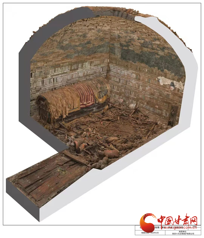 2021年,考古項目組對新發(fā)現(xiàn)的天??h祁連鎮(zhèn)長嶺-馬場灘區(qū)3座墓葬進行了考古發(fā)掘,發(fā)掘面積600平方米。3座墓葬均為帶斜坡墓道的單室磚室墓,其中馬場灘M1還附帶一側(cè)室,甚為獨特。墓道內(nèi)均殉有整馬,1-3匹不等,墓室均遭盜掘,頂部坍塌,北側(cè)設(shè)磚砌棺床,共出土各類文物290余件。
