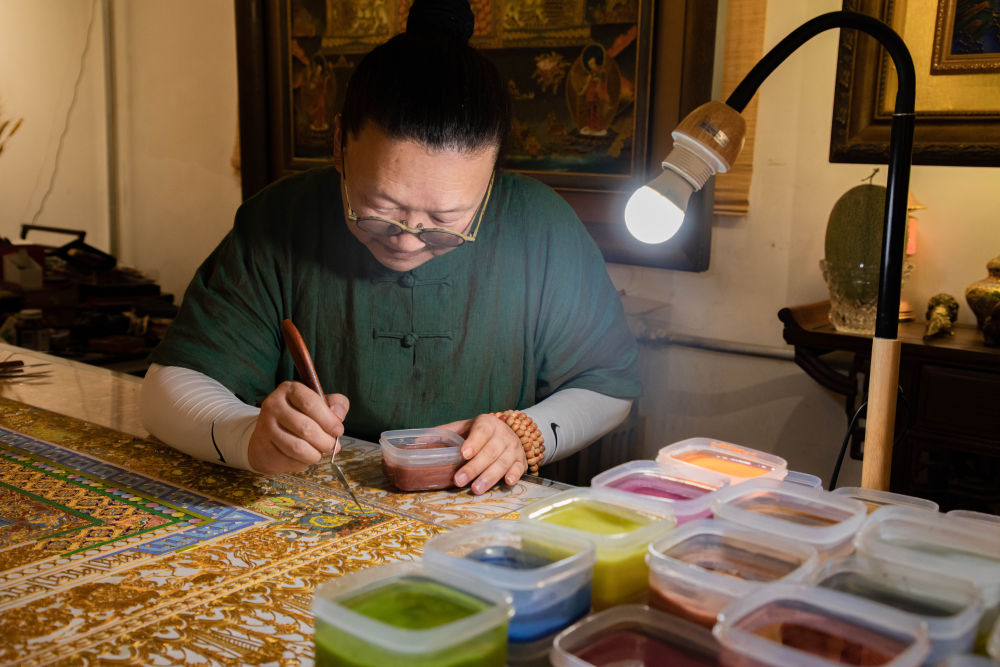 李海明在為一幅掐絲琺瑯壁畫(huà)上色。新華社記者郎兵兵攝