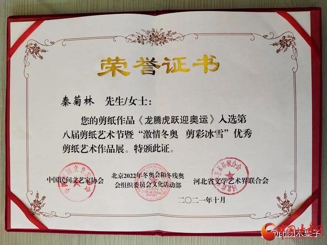 2021年11月由中國民間文藝家協(xié)會、河北省文學(xué)藝術(shù)界聯(lián)合會主辦,河北省民間文藝家協(xié)會、中共蔚縣人民政府承辦的“第八屆剪紙藝術(shù)節(jié)暨激情冬奧.剪彩冰雪”優(yōu)秀剪紙藝術(shù)大賽中,剪紙作品《龍騰虎躍迎奧運(yùn)》榮獲優(yōu)秀收藏作品同時被河北省蔚縣博物館永久收藏,并頒發(fā)收藏證書。