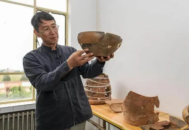 南佐遺址聯(lián)合考古隊(duì)領(lǐng)隊(duì)、中國人民大學(xué)歷史學(xué)院考古文博系教授韓建業(yè)在遺址研究基地內(nèi)展示出土的陶器(8月23日攝)。新華社記者 李賀 攝