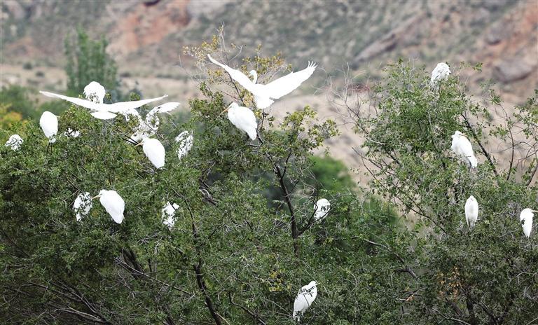 中國(guó)甘肅網(wǎng)10月14日訊 據(jù)蘭州日?qǐng)?bào)報(bào)道 金秋十月,蘭州新區(qū)秦王川國(guó)家濕地公園秋意漸濃。近日,隨著近百只白鷺的光臨,秦王川國(guó)家濕地公園再次迎來(lái)了候鳥遷徙的高峰期,成群的白鷺憩息在樹枝,繪就了一幅亮麗的秋景圖。