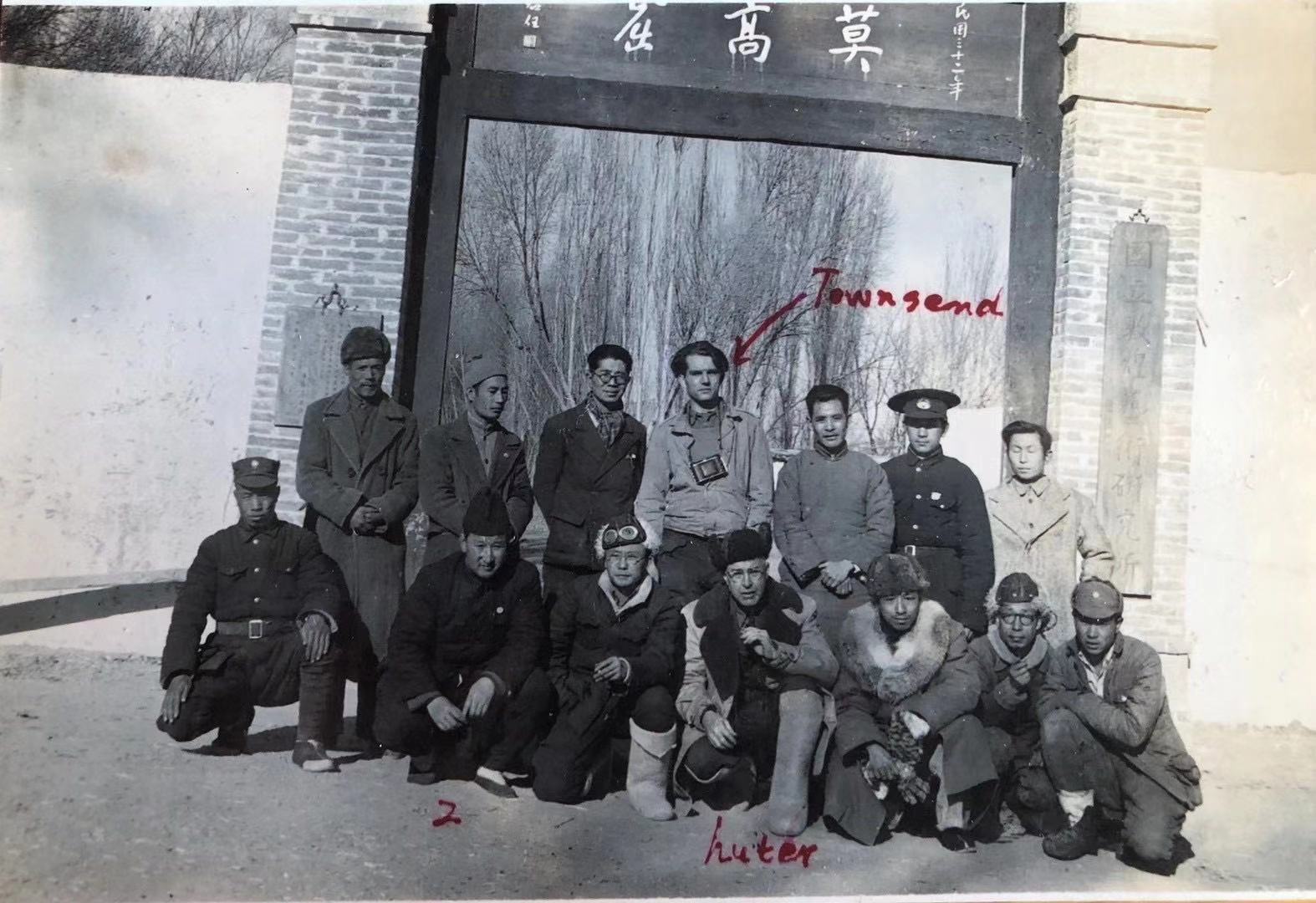 1945年4月張官廉(前排左三)陪同英國議員、英國消費合作社總社負(fù)責(zé)人胡特(后排中)考察山丹培黎學(xué)校期間在敦煌莫高窟前合影