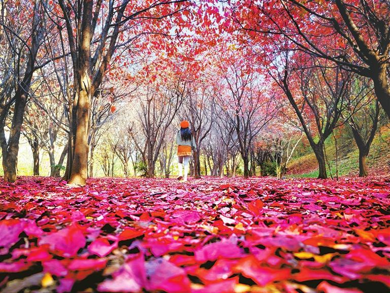 深秋的天水市秦州區(qū)南郭寺大景區(qū)被豐富多彩的顏色包圍,蜿蜒曲折的道路兩旁,各種樹(shù)木色彩斑斕、美不勝收。一陣微風(fēng)吹過(guò),五彩斑斕的樹(shù)葉落到山間的步道上,鋪就了一層“多彩絢麗的地毯”。漫步其中,一幅人與自然各美其美、美美與共的美麗畫(huà)卷依山鋪就開(kāi)來(lái),迷醉游人。那一刻,詩(shī)圣杜甫《秦州雜詩(shī)》秋天里的南郭寺,在陽(yáng)光的輝映下,滿目秋色皆是美景、皆是詩(shī)意。