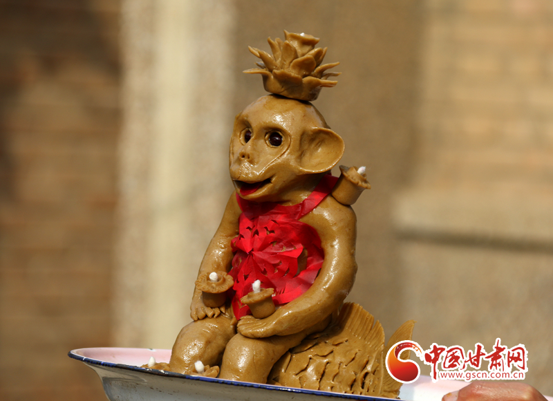 大面猴身上的面燈是專供一對(duì)新人來(lái)點(diǎn)的,所以面猴的做工尤為精心,在面猴的眼睛上還鑲嵌了明溜溜的黑豆,在胸前系著紅肚兜,看上去憨態(tài)可掬。