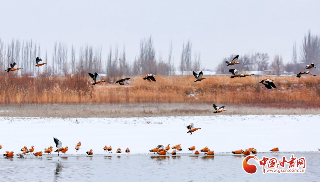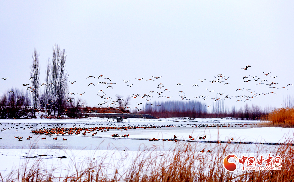 12月20日,在甘肅省酒泉市銀達(dá)鎮(zhèn)花園水庫,一群候鳥正在戲水、覓食,為祁連山下的戈壁大地增添了一道亮麗的景色。