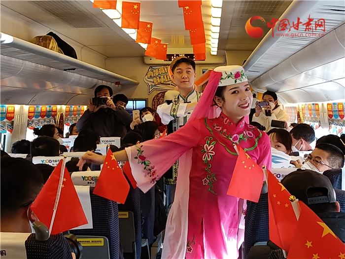 飛天與花兒相擁,甘肅與寧夏直通。蘭銀高鐵中蘭段開通,也讓銀蘭高鐵全線貫通。為了慶祝這一歷史時刻,D9058次列車乘務組準備了精彩的節(jié)日。《花兒與少年》展演寧夏風情,遇見塞上花開。敦煌樂舞,充滿甘肅元素講述飛天故事,巧妙的節(jié)目安排生動地展示了甘肅、寧夏兩省區(qū)的文化元素,讓旅途不僅有一路風光,更有一路風情。