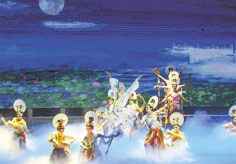 《絲路花雨》由甘肅省歌舞劇院創(chuàng)排,取材于敦煌壁畫藝術(shù),博采各地民間歌舞之長,展現(xiàn)了唐朝對外經(jīng)濟(jì)、文化交往頻繁的盛況。