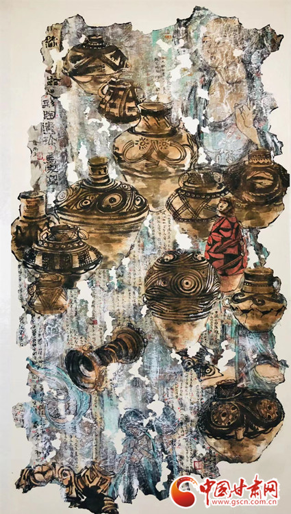 他的這幅作品《絲路遺珍-馬家窯》于2018年獲甘肅美術(shù)專業(yè)最高獎“金駝獎”,采用黃河的“s”型構(gòu)圖展開,將八千年前新石器時代大地灣文化、馬家窯文化的經(jīng)典代表器物分次展開。作品左上角及中間部分依次疊加,穿插,繪制中與敦煌文化中的壁畫、飛天、佛像有機結(jié)合,寓示絲路文化有序傳承、源遠流長,又對畫面的視覺撥高提升。