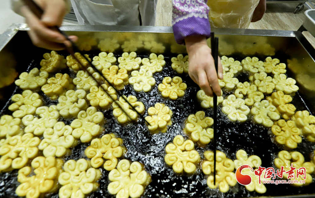 據(jù)悉,春節(jié)前炸“糖花子”是山丹縣的傳統(tǒng)習(xí)俗,至今已有百年歷史。“油炸糖花子”用醒發(fā)后的面餅切成寬約六厘米,長約九厘米的長方形,中間再切通三道裂縫,用手翻成圖案花狀,下油鍋緩煎慢炸。炸好的糖花黃中透紅,酥脆香甜,成為春節(jié)待客的頭等美食。