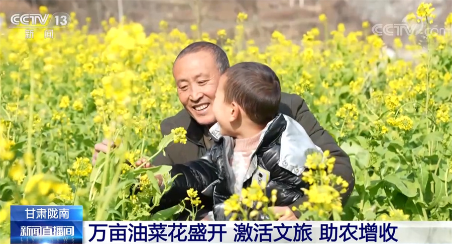 總臺記者 項思:這里是甘肅省隴南市文縣,位于甘肅的最南端,也是甘肅最早迎來春天的地方。一江碧水、兩岸青山,大面積盛開的油菜花迎著和煦的春風(fēng)泛起金色的波浪,一股濃烈的春天氣息撲面而來。從春節(jié)前10天左右,這里的萬畝油菜花就陸續(xù)開放了。如今步入春天,油菜花已進(jìn)入盛花期。文縣接壤四川,嘉陵江的上游白龍江穿越境內(nèi),氣候溫暖潮濕,具有夏無酷暑、冬無嚴(yán)寒的氣候特點,被稱為“隴上江南”。