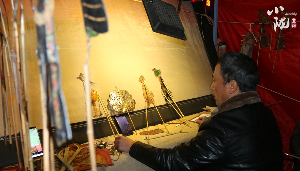 一張幕布、兩盞白熾燈、四五老藝人、七八件簡單樂器,藝人在白色幕布后面,一邊用手操縱戲曲剪紙人物,一邊用本地流行曲調(diào)唱述故事,同時(shí)配以器樂以增加演戲氣氛。