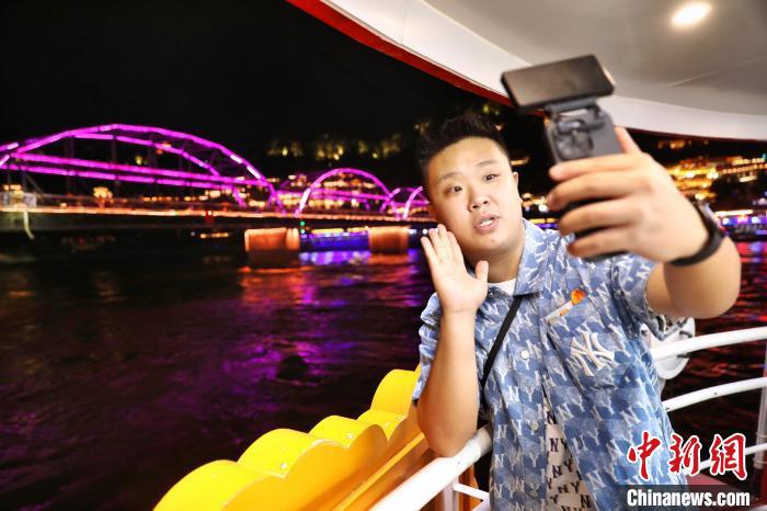 7月16日,“絲路風(fēng)采 如意甘肅”海峽兩岸記者聯(lián)合采訪活動(dòng)在甘肅蘭州啟動(dòng)。圖為臺灣自媒體人林惟綱在“黃河第一橋”——中山橋下拍攝短視頻?!≈行律缬浾?nbsp;李雪峰 攝