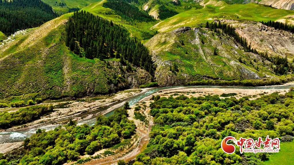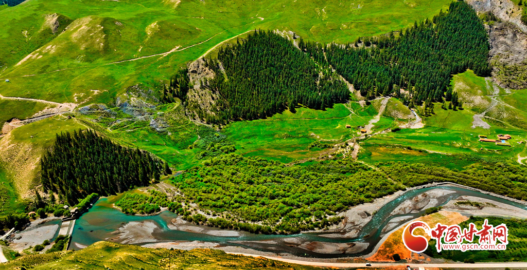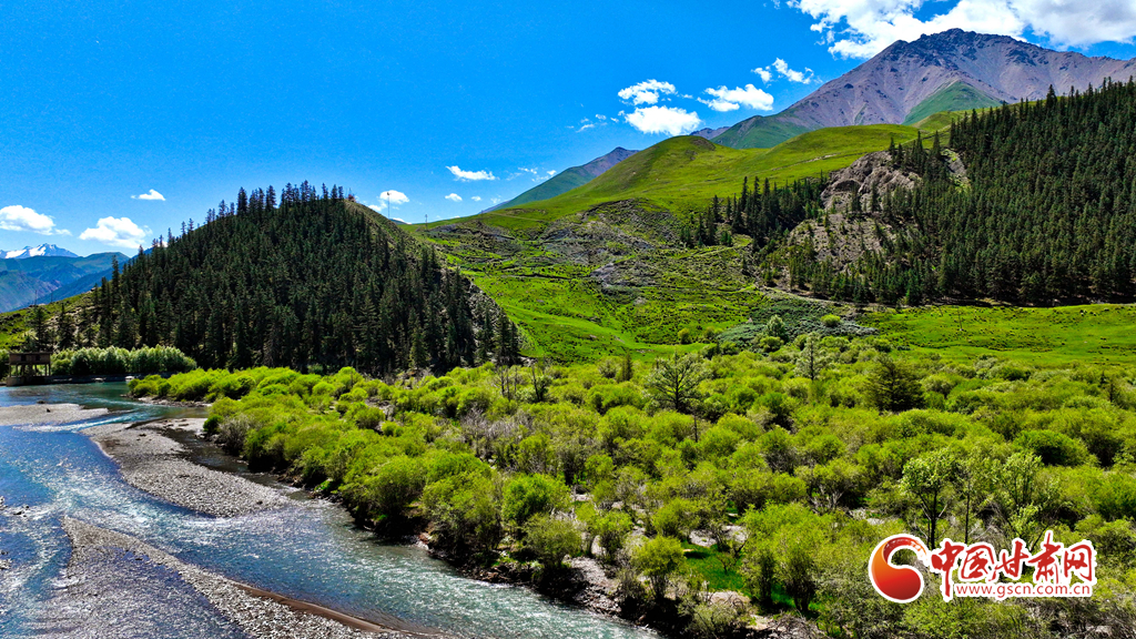 7月22日,祁連山國家公園甘肅省張掖市肅南裕固族自治縣大河鄉(xiāng)段,藍天白云下,巍峨壯麗的祁連山蒼松翠柏矗立其間,綠草如茵、水光粼粼,如同一幅壯美與秀麗并存的山水畫卷。