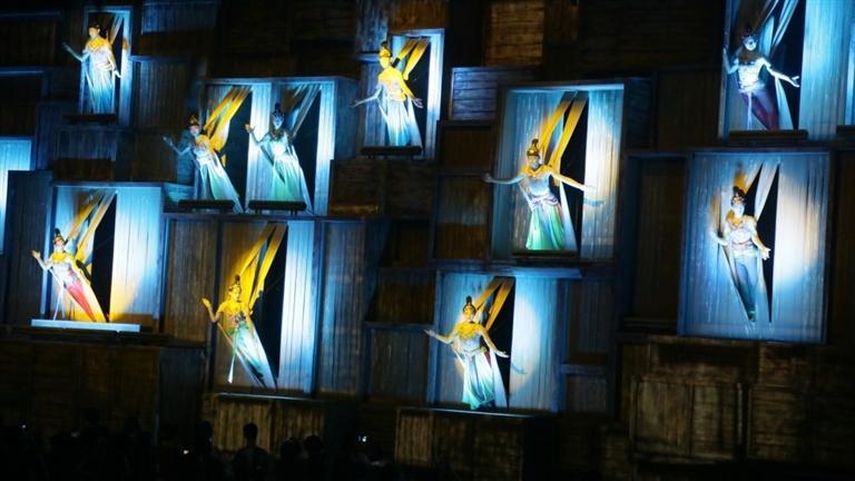 活化敦煌古樂器、古樂譜研發(fā)成果的《樂動(dòng)敦煌》,采用全息投影、3D威亞等高科技手段,以全沉浸式的呈現(xiàn)方式,演繹了西域少年白氏追尋藝術(shù)的動(dòng)人故事,劇中運(yùn)用了來(lái)自敦煌壁畫中復(fù)原的五弦琵琶、排簫、蓮花阮等16件古樂器,演繹了胡旋舞、腰鼓舞、琵琶舞等多種敦煌舞蹈,還原了敦煌壁畫中的樂舞盛景。