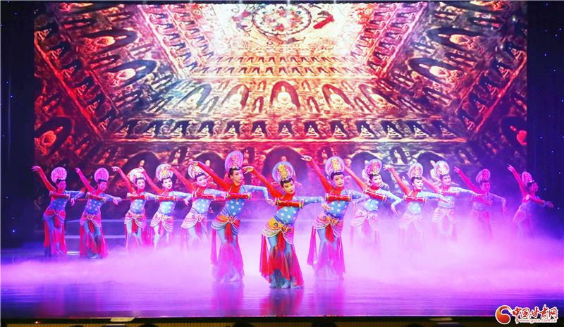 除了甘肅省民族歌舞團(tuán)和西北民族大學(xué)舞蹈學(xué)院聯(lián)袂獻(xiàn)上的精彩節(jié)目外,當(dāng)晚,肅州區(qū)文化館還為觀眾奉獻(xiàn)了舞蹈《西域羯鼓》。據(jù)悉,羯鼓源自西域,狀似小鼓,兩面蒙皮,均可擊打,既能表現(xiàn)快速緊急或激烈的情緒,又可以用散淡悠長來營造靜謚雅致的氛圍。表演中,舞者著霓裳,帶搖冠、掛嚶珞,貼著金花的衣裙飄曳、巾帶飛舞,四周天花飛落,如夢如幻。該節(jié)目通過歡快的音樂、輕快的舞步、流暢的隊形變換等形式,展現(xiàn)了極具特色民族舞蹈風(fēng)格,也反映了隴原兒女團(tuán)結(jié)奮進(jìn)、昂揚向上的精神面貌。