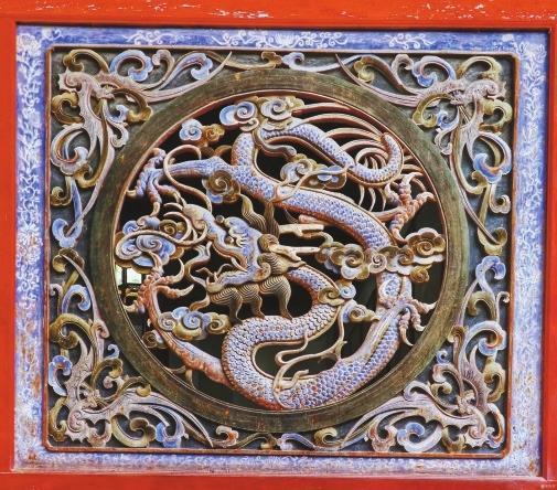 天水伏羲廟位于天水市秦州區(qū)西關(guān)伏羲路,是目前我國規(guī)模最宏大、保存最完整的紀念伏羲氏的明代建筑群,1963年被列為甘肅省重點文物保護單位。伏羲廟中有一對龍鳳檻窗木雕,是明代木雕中天水雕刻技法傳世至今的佳作,約有500年歷史。當時匠人將多塊油松木板拼接成方形,再以透雕技法在框內(nèi)圈雕圓形,中刻龜背舞鳳,外飾祥云蝙蝠,龍鳳雀躍,惟妙惟肖,最后用礦物顏料上色點睛。龍鳳檻窗木雕將藝術(shù)性和功能性完美統(tǒng)一,承載了諸多文化寓意。有學者認為,這組木雕的圖案既歌頌了伏羲開創(chuàng)中華文明的豐功偉績,又體現(xiàn)了對古文化的一脈傳承。