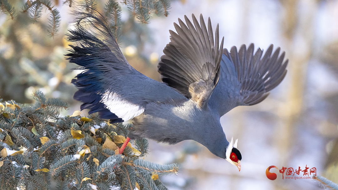 冬日里,藍(lán)馬雞成群飛落山腳覓食,藍(lán)羽丹頂行走在雪地格外搶眼。覓食時,藍(lán)馬雞常用爪刨挖林中空地苔蘚和林緣草地,尋找掉落的云杉種子,刨食的過程會使土壤裸露出來,便于云杉種子生根發(fā)芽,促進(jìn)云杉林天然更新。