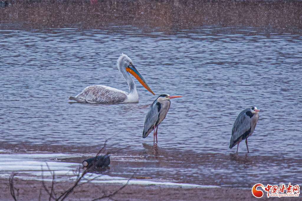 當(dāng)天,天空下著大雪,天氣寒冷,一位野生鳥類攝影愛好者驚喜地在崇信縣汭河段發(fā)現(xiàn)了一只卷羽鵜鶘盤旋于河道上空,經(jīng)過跟蹤其降落于發(fā)現(xiàn)地20里外的銅城水庫附近水域,與蒼鷺混群。