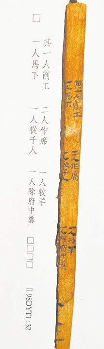 簡(jiǎn)7是都尉府戍卒日作簿,戍卒分工簡(jiǎn)明清楚。“削工”用紅柳、胡楊木削制簡(jiǎn)牘。作席,疏勒河沿岸生長(zhǎng)著大量芨芨草、蘆葦,戍卒用來(lái)編制席笆,用于防潮御寒。疏勒河沿岸水草豐茂,適宜放牧。“一人牧羊”可知,養(yǎng)牛、羊供都尉府吏員食用。“一人馬下”,由于缺當(dāng)時(shí)的語(yǔ)言環(huán)境,釋義模糊。千人是都尉府中級(jí)軍官職務(wù)。除府中糞,清除廁所糞便。