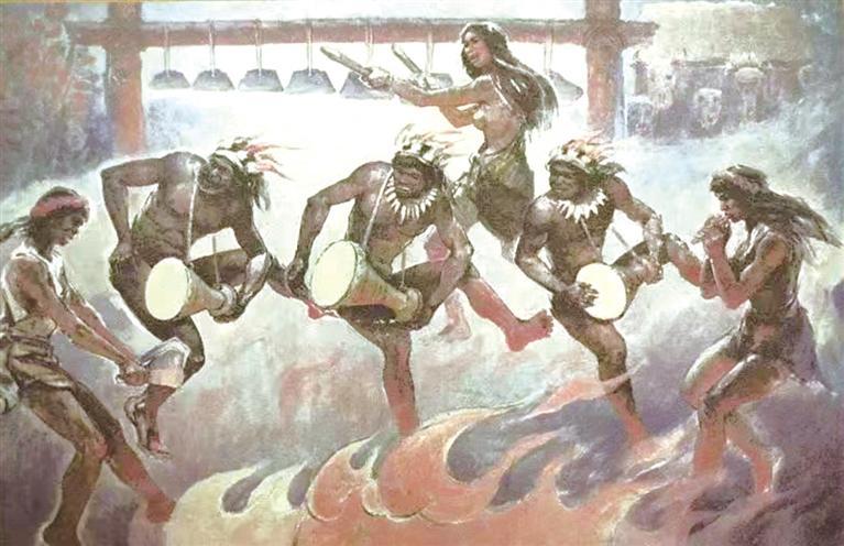 可以想見(jiàn),在4000多年前的一個(gè)傍晚,先民們圍著篝火,系上繪有華麗紋飾的彩陶鼓,手拉手,和著呼喊的節(jié)奏,隨著歡快的鼓點(diǎn)唱著、跳著,來(lái)慶祝一天的收獲。