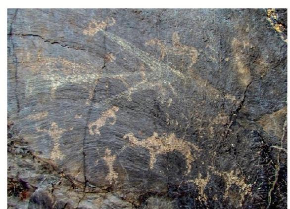 黑山巖畫全稱為“黑山摩崖淺石刻巖畫”,分布于嘉峪關(guān)西北約 10—20公里處的黑山峽谷陡崖峭壁上,為遠(yuǎn)古時(shí)期黑山地區(qū)游牧民族生產(chǎn)、生活的真實(shí)記錄?,F(xiàn)共發(fā)現(xiàn)分布在黑山石關(guān)峽口、磨子溝、蕉蒿溝、四道股形溝、紅柳溝、交河溝六處戰(zhàn)國(guó)至明代時(shí)期的巖畫,共 157 幅。黑山巖畫反映的時(shí)限跨度大,時(shí)空關(guān)系復(fù)雜,涉及部族較多。畫面所反映的內(nèi)容豐富多彩,有動(dòng)物、人物、佛塔、植物等,還有大型的操練舞蹈場(chǎng)景。涉及人類學(xué)、社會(huì)學(xué)、歷史學(xué)、考古學(xué)、美術(shù)學(xué)、生物學(xué)、地理學(xué)等多個(gè)學(xué)科,具有較高的研究?jī)r(jià)值。