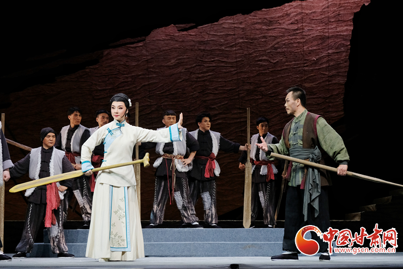 在唱腔設(shè)計上,該劇既有傳統(tǒng)的保留,也有創(chuàng)新的嘗試。在隴東老道情的基礎(chǔ)上,通過音樂和配器的創(chuàng)新,提升了音樂的張力和表現(xiàn)力。現(xiàn)場演出采用了民族管弦樂隊伴奏,使音樂更具交響性,更加豐富多彩,這也是該劇音樂方面的最大創(chuàng)新?! ?/p>