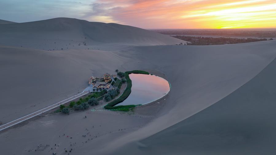 這是6月6日拍攝的鳴沙山月牙泉(無人機照片)。新華社記者 郎兵兵 攝