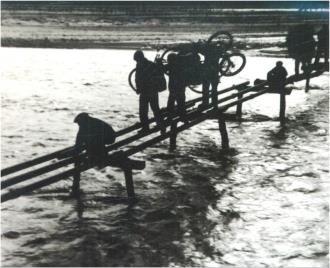 左圖為改造后的備戰(zhàn)橋,右圖為昔日涇河沿岸群眾搭建簡易木橋過河的畫面。 ?。ㄡ轻紖^(qū)檔案館供圖)
