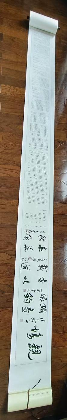 該長卷是白建新繼200米硬筆書法長卷《蛙》之后的又一部力作。作者耗時(shí)一年四個(gè)月,用硬筆楷書在四尺對開的宣紙上創(chuàng)作的《海峽兩岸著名作家系列 親情散文卷》,字體嚴(yán)謹(jǐn),書風(fēng)純正,字形一厘米見方,盡顯歐楷風(fēng)體。全篇近30萬字,共分5卷,幅長達(dá)250米。