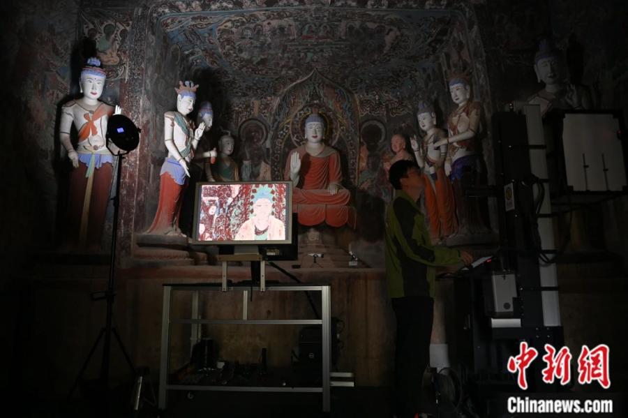 2024年6月,甘肅敦煌莫高窟內(nèi),敦煌研究院文物數(shù)字化研究所工作人員進行敦煌壁畫數(shù)字化采集工作。李亞龍 攝
