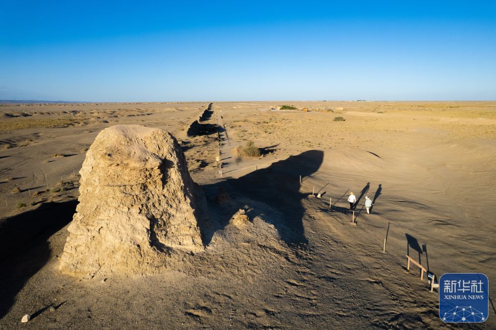 ↑這是張吉全和聞春瑜夫婦負(fù)責(zé)巡護(hù)的一段漢長(zhǎng)城遺址(7月16日攝,無(wú)人機(jī)照片)。
