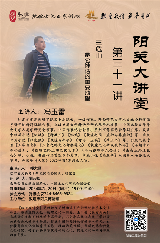 中國甘肅網(wǎng)7月18日訊 7月20日,西北師范大學(xué)甘肅文化發(fā)展研究院常務(wù)副院長、一級(jí)作家、玉文化學(xué)者馮玉雷將在線進(jìn)行題為《三危山:昆侖神話的重要地望》的講座。本次講座由敦煌陽關(guān)博物館主辦,為“敦煌文化百家講壇”第31講,遼寧省文物考古研究院名譽(yù)院長、資深考古學(xué)家、玉學(xué)家郭大順研究員擔(dān)綱主持,陜西省文物局原副局長、中國玉文化研究會(huì)副會(huì)長、資深玉學(xué)家劉云輝教授擔(dān)綱評(píng)議。